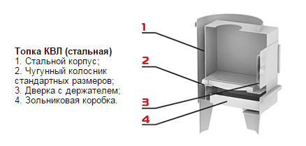 Топка раздельная, является более универсальной и ремонтнопригодной, включает в себя камеру горения, колосник, дверку с отражателем и зольник. Зольник позволяет регулировать тягу и осуществлять удалять продукты горения, просыпающиеся через щели колосника. Дверца обеспечивает безопасность горения топлива и защищает от жесткого инфракрасного излучения (при установке колонки желательно сориентировать дверцу топки в направлении удобном для закладки дров). В зависимости от модификации, баки могут быть из окрашенной стали (КВЛ бак) для водогрейной колонки (КВЛ-90), из нержавеющей стали (КВЛН бак) для водогрейной колонки (КВЛН-90).