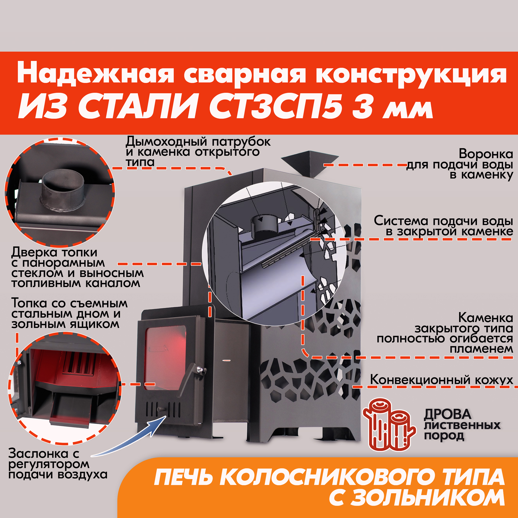 Конструкция предусматривает максимальный нагрев камней внутри, а особая система подачи воды, разливающая по всей длине каменки, обеспечивает мягкий и мелкодисперсный пар, характерный для русской бани.