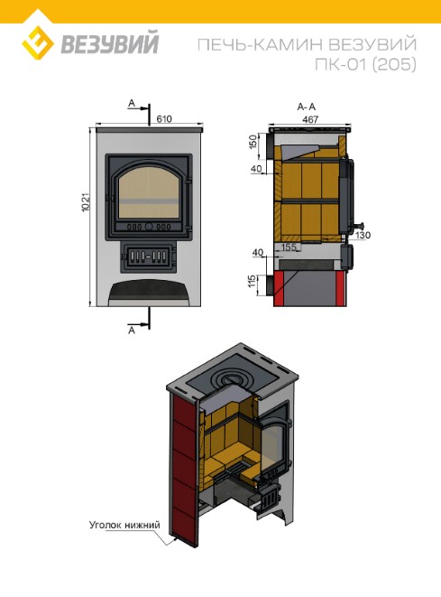 Главные преимущества этой печи-камина - применение высококачественных, жароустойчивых материалов, стали и чугуна. Это обещает владельцу долговечную и надежную службу камина.