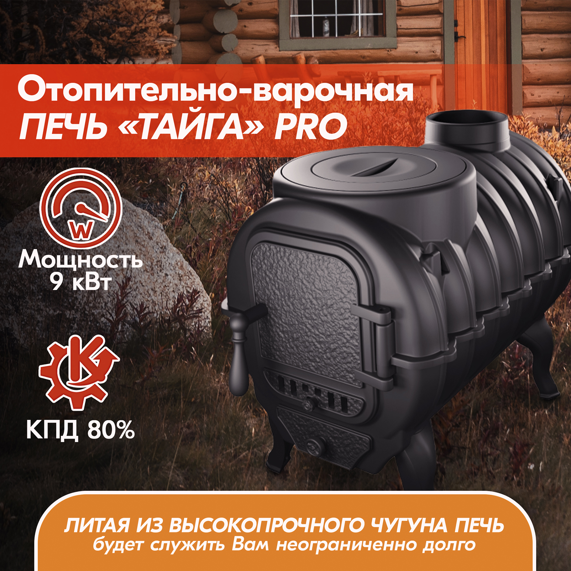 «Тайга» PRO - это небольшая и оригинальная отопительно-варочная печь мощностью 9 кВт способная достаточно быстро обогреть помещение объемом до 100 куб.м или площадью 40 кв. м при высоте потолка 2,5 м!